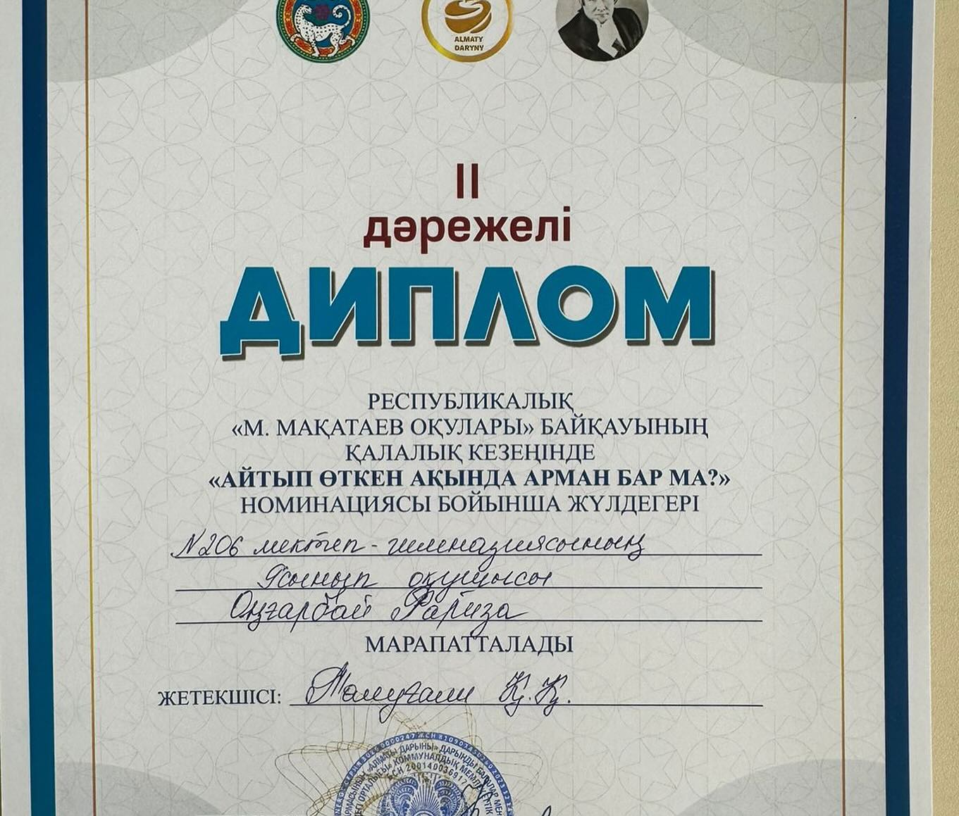 Республикалық Мұқағали оқуының қалалық кезеңінде “ Айтып өткен ақында арман бар ма?” бағыты бойынша 10-сынып оқушысы Оңғарбай Фариза ІІ орынмен марапатталды. » №206 мектеп-гимназия